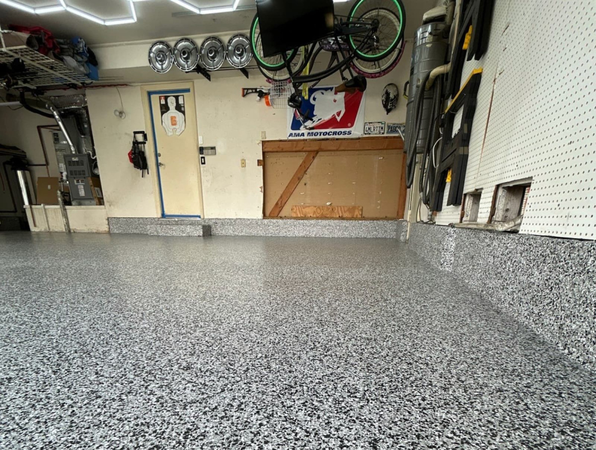 Gerber installs high-performance garage floor coatings using a polyaspartic polyurea system described as outperforming traditional epoxy floors in nearly every way. The system bonds directly to the concrete rather than sitting on top of it, creating a tougher, longer-lasting surface that holds up to heat, impacts, daily use, and hot tire pickup. Installation is typically completed in just one day, reducing downtime. Homeowners can choose a flake color to match their style, and optional coatings for steps, stem walls, and small vertical surfaces help the space feel more finished and polished.
