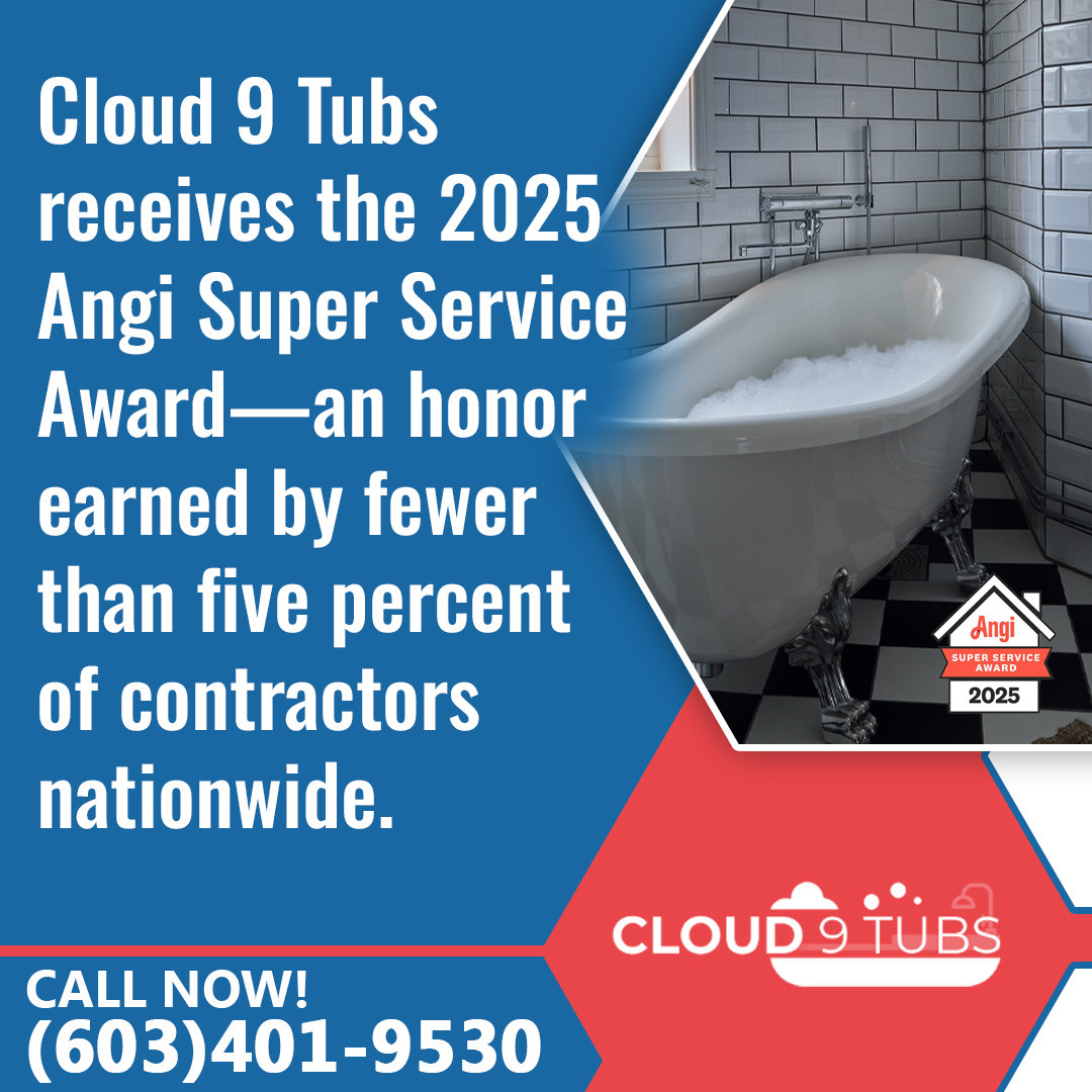 Salem, NH - Cloud 9 Tubs LLC, a specialist in walk-in shower and bathtub conversions across New Hampshire and Southern Maine, has received the 2025 Angi Super Service Award. Fewer than five percent of contractors nationwide earn this distinction each year. The recognition reflects verified customer satisfaction, consistent installation quality, and a track record of service excellence. For homeowners planning a bathroom upgrade or seeking walk-in shower installation in Salem, NH, the award confirms Cloud 9 Tubs as a trusted and proven provider.